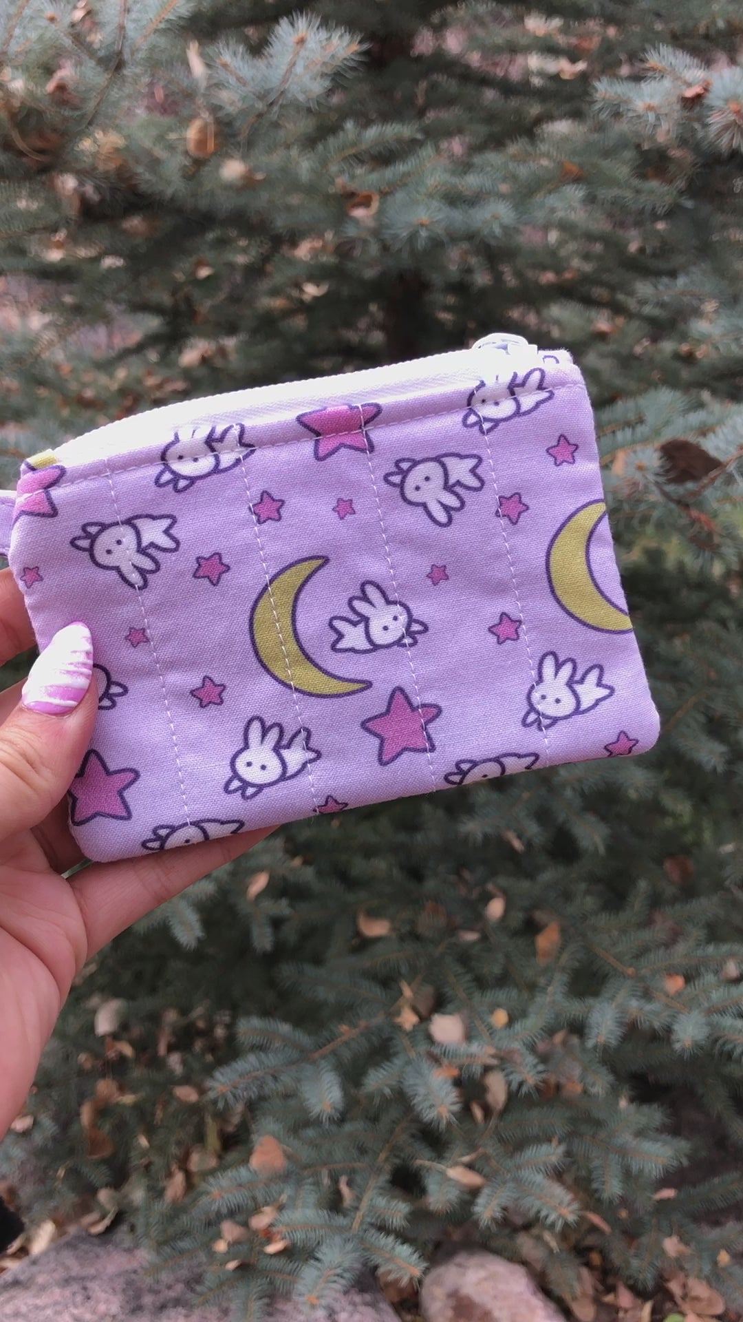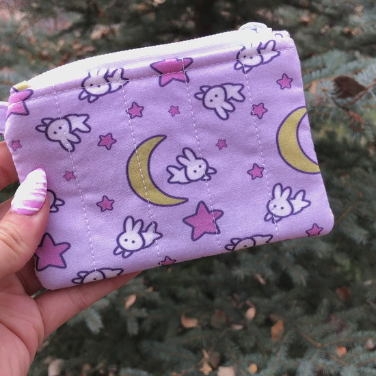This hand-sewn, quilted mini pouch is perfect for holding your cards, IDs, loose change, or even small trinkets! This wallet features a pink-purple fabric with pink stars, yellow moons, and white bunnies, with a purple gingham lining and a white zipper. The split ring allows this wallet to be attached to your bag or wristlet for easy hands-free access and its discreet size makes it perfect for being on the go.