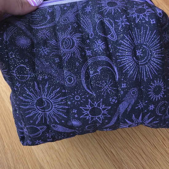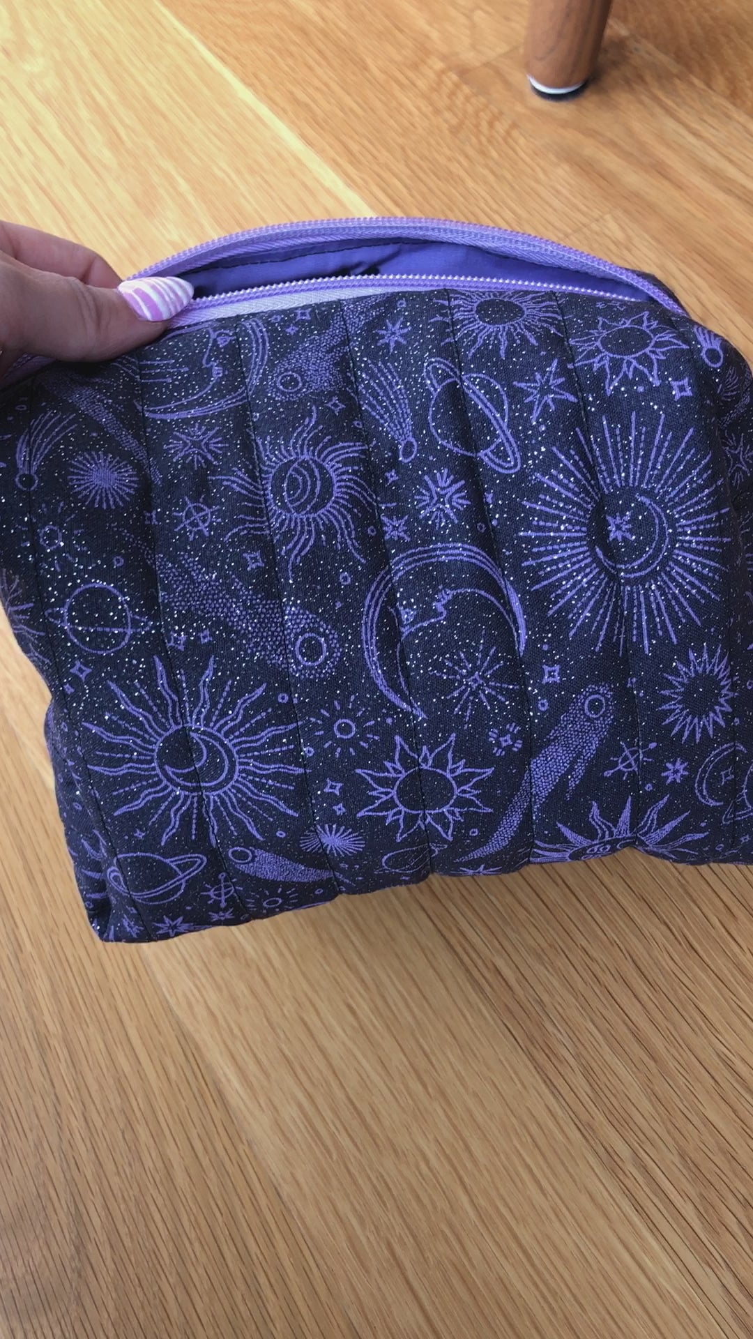 This carryall makeup bag is perfect for all your cosmetic needs. It's hand-sewn, roomy, stylish, and designed to keep your essentials organized at home or on the go. Fits nicely in your bag and is perfect for everyday use or for travel. This beautiful glittery purple and black print is lined with a purple fabric and has a matching zipper. The quilted exterior adds durability and luxury to the bag while also keeping your brushes, palettes, and skincare safe.