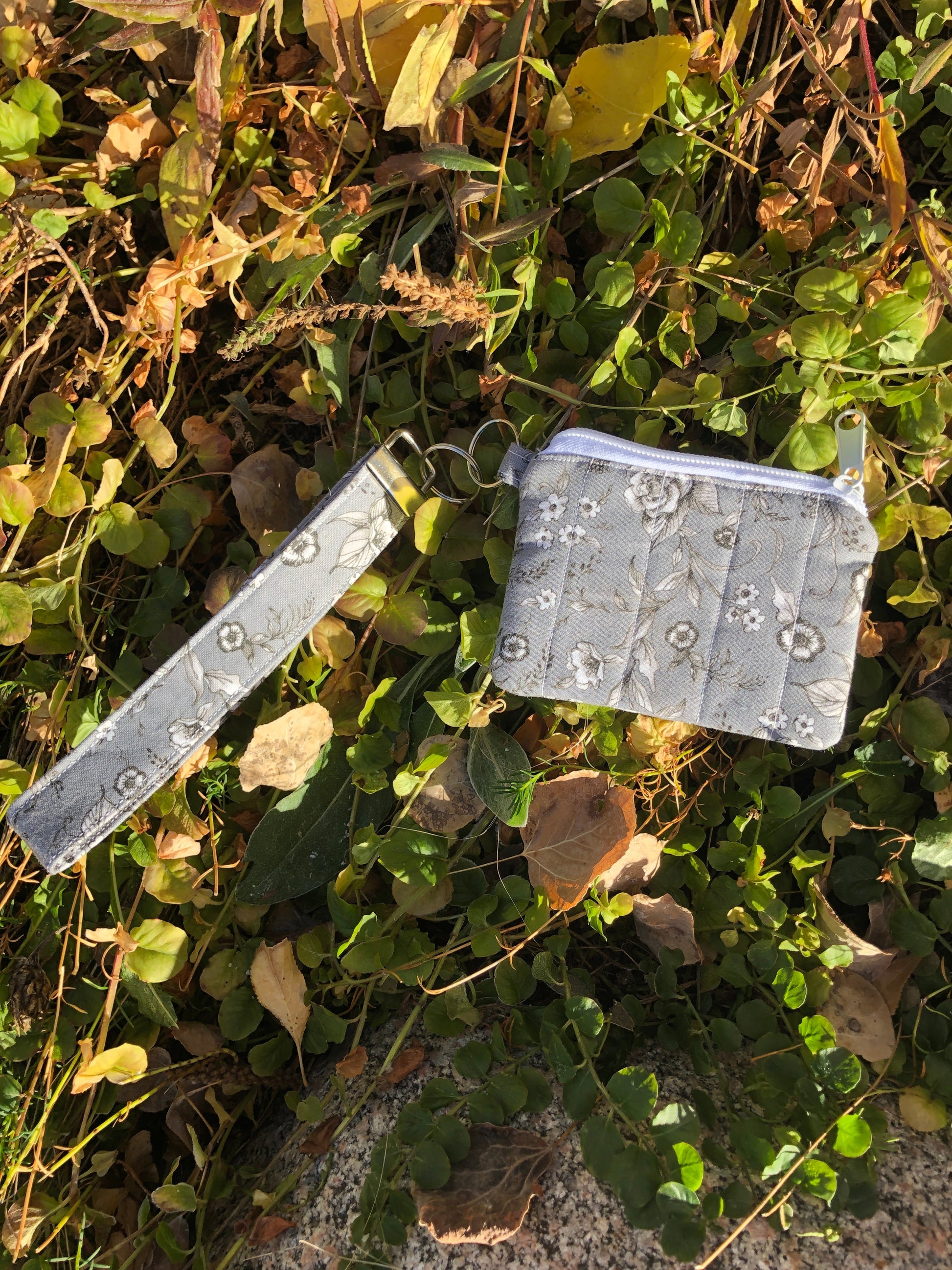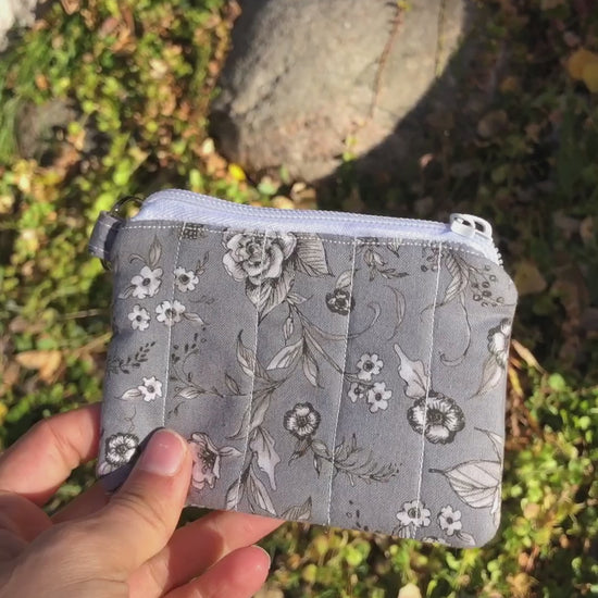 This hand-sewn, quilted mini pouch is perfect for holding your cards, IDs, loose change, or even small trinkets! This beautiful grey and white floral print is lined with a white fabric and has a matching zipper. The split ring allows this wallet to be attached to your bag or wristlet for easy hands-free access and its discreet size makes it perfect for being on the go.