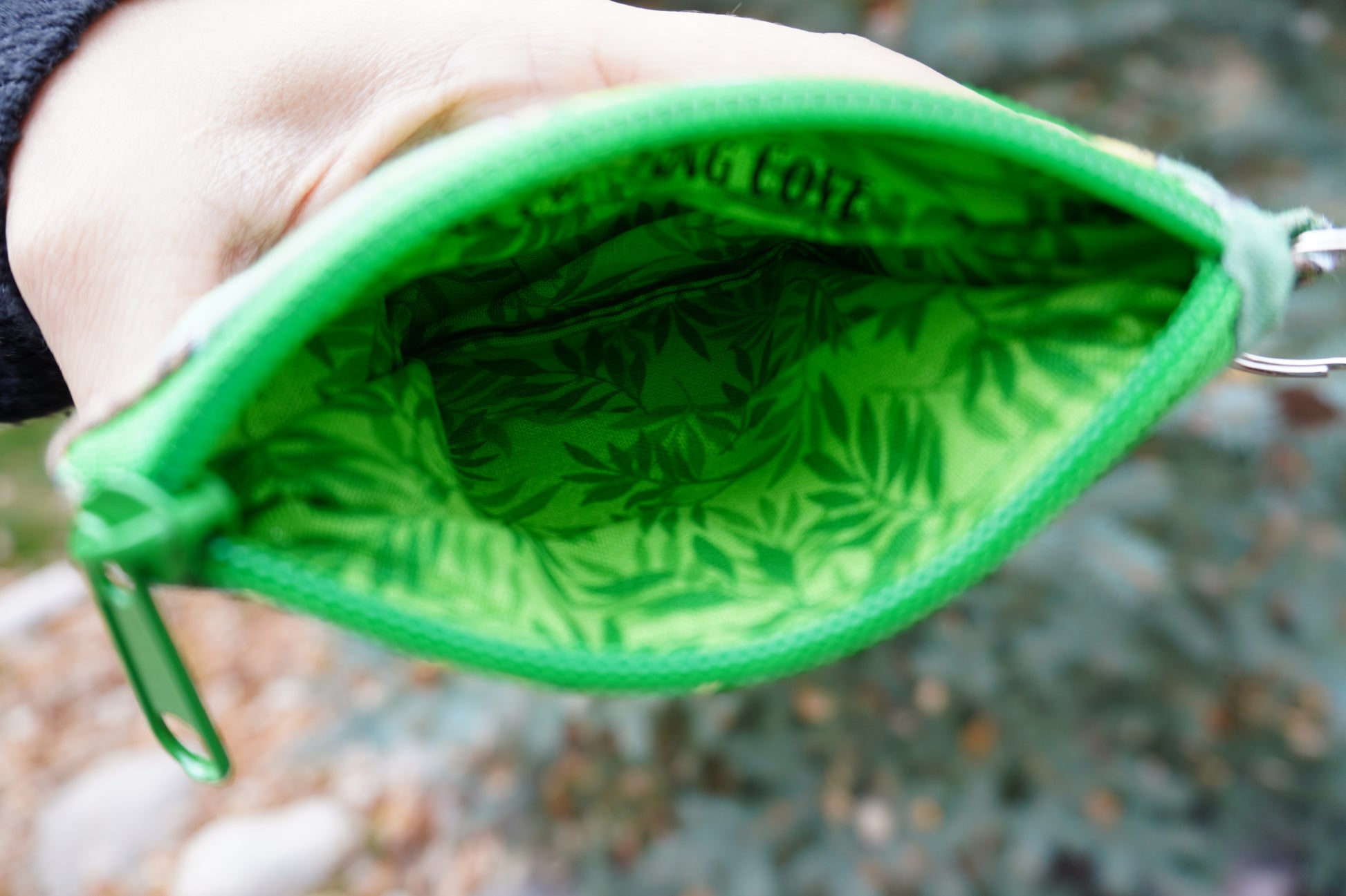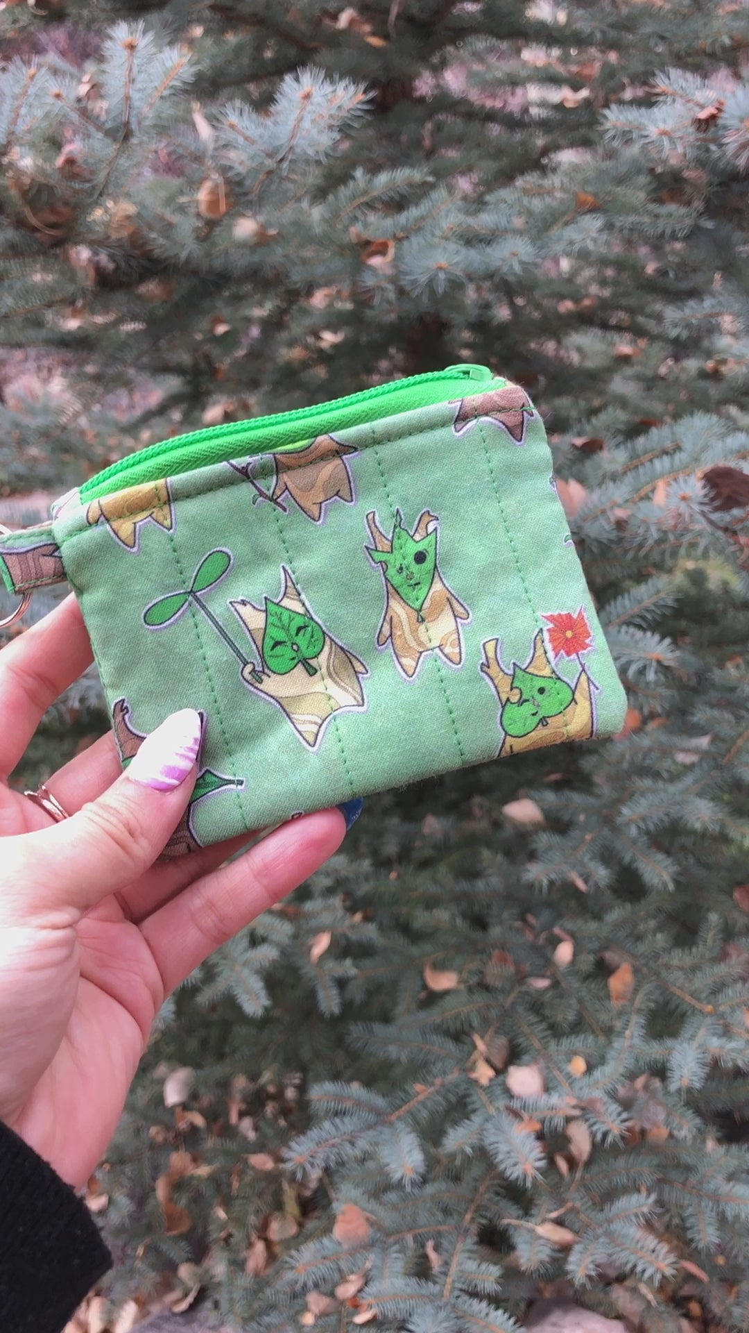 This hand-sewn, quilted mini pouch is perfect for holding your cards, IDs, loose change, or even small trinkets! This wallet features a green fabric with woodland spirits, a green leaf print lining, and a green zipper. The split ring allows this wallet to be attached to your bag or wristlet for easy hands-free access and its discreet size makes it perfect for being on the go.